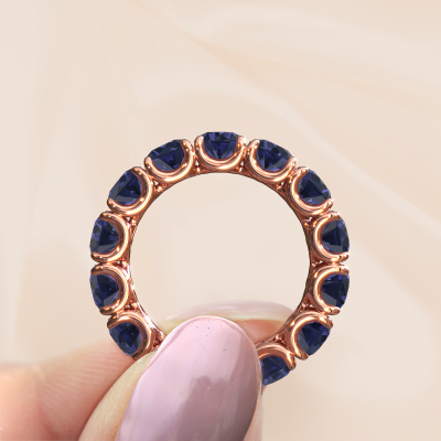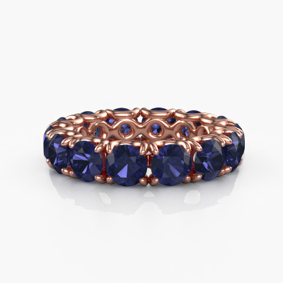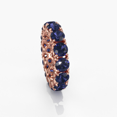 Das ist unser Estee 4.7-Ring. Dieser spezielle Typ wird als Eternity ring bezeichnet und ist mit einer durchgehenden Linie von identisch geschliffenen Edelsteinen besetzt. Er ist aus 14 Karat Roségold und mit kleineren Saphir 4.7 mm besetzt. Dieser Roségold Eternity Ring ist eine wunderschöne und sinnvolle Möglichkeit, Ihrem Antrag eine besondere Note zu verleihen. Die herrlich gleichmäßig geformten Saphir sind rund um den Ring eingefasst. Die identischen Saphir werden sorgfältig ausgewählt, um dem Ring eine maximale Wirkung zu verleihen. Denken Sie daran, dass wir natürliche Ressourcen verwenden. Daher sind kleine Unterschiede zwischen den Steinen üblich. Der besondere Effekt wird durch die präzise Positionierung der Saphir noch verstärkt. Dies erfordert äußerste Präzision und eine geschickte Hand. Für unsere erfahrenen Juweliere ist die pure Leidenschaft. Am Ende bekommen Sie einen Ring mit einer Reihe von Saphir, die weder Anfang noch Ende zu haben scheinen. Das perfekte Symbol für Ihre Liebe zu ihr! Ist sie nicht eine Schönheit? Mit unserer modernen Technik können wir Schmuckstücke von höchster Qualität mit größter Sorgfalt für Sie entwerfen und anpassen. Unsere Ringe sind immer um 30 Prozent günstiger als bei anderen Juwelieren. Wir fertigen Ringe auf Bestellung, also müssen wir keine großen Lager unterhalten. Wenn Sie ein bestimmtes Budget haben, beraten wir Sie gerne entsprechend.