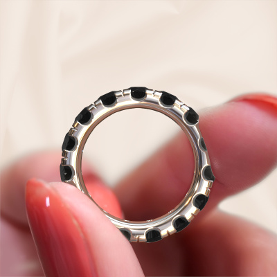 Das ist unser Jackie 4.2-Ring. Dieser spezielle Typ wird als Eternity ring bezeichnet und ist mit einer durchgehenden Linie von identisch geschliffenen Edelsteinen besetzt. Er ist aus 14 Karat Weißgold und mit kleineren Schwarz Diamant 0.36 crt besetzt. Dieser Weißgold Eternity Ring ist eine wunderschöne und sinnvolle Möglichkeit, Ihrem Antrag eine besondere Note zu verleihen. Die herrlich gleichmäßig geformten Schwarze Diamanten sind rund um den Ring eingefasst. Die identischen Schwarze Diamanten werden sorgfältig ausgewählt, um dem Ring eine maximale Wirkung zu verleihen. Denken Sie daran, dass wir natürliche Ressourcen verwenden. Daher sind kleine Unterschiede zwischen den Steinen üblich. Der besondere Effekt wird durch die präzise Positionierung der Schwarze Diamanten noch verstärkt. Dies erfordert äußerste Präzision und eine geschickte Hand. Für unsere erfahrenen Juweliere ist die pure Leidenschaft. Am Ende bekommen Sie einen Vorsteckring mit einer Reihe von Schwarze Diamanten, die weder Anfang noch Ende zu haben scheinen. Das perfekte Symbol für Ihre Liebe zu ihr! Ist sie nicht eine Schönheit? Nachdem Sie Ihre Bestellung aufgegeben haben, beginnen unsere Goldschmiede mit dem kreativen Prozess der Herstellung Ihres Jackie 4.2 Ring. Wir haben keine Lager. Das ist vorteilhaft, da diese Kosten nicht an Sie weitergegeben werden. Daher sind wir in der Lage, Schmuck zu außergewöhnlich niedrigen Preisen anzubieten.Unsere Online-Kollektion wird täglich um neue Schmuckdesigns ergänzt. Unser Team von leidenschaftlichen Designern ist bemüht, außergewöhnliche und vielfältige Designs zu kreieren. Haben Sie einen Ring gesehen, der Ihnen gefällt? Setzen Sie sich mit uns in Verbindung. Basierend auf einem guten Preis/Leistungsverhältnis machen wir Ihnen ein Angebot, das Sie nicht ablehnen können!Um es einfacher zu machen, bieten wir eine kostenlose 30-tägige Rücksendung.
