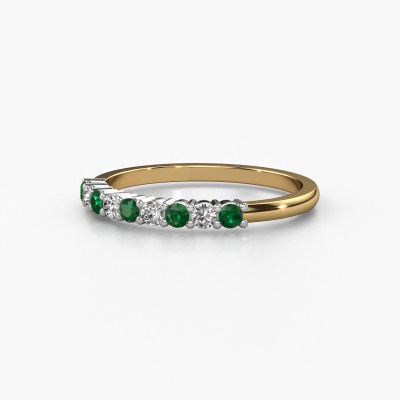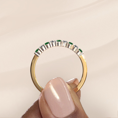 Dieser 9 Stone Ring wird Yasmin 9 genannt. Diese Art von Ring wird als Memoire ring bezeichnet, da seine Edelsteine in einer durchgehenden Linie angeordnet sind. Dadurch kann er einfach mit anderen Ringen kombiniert werden. Das Band dieses 14 Karat Gold Ring ist in einer Kombination aus Smaragd und Diamant besetzt. Sie können ganz einfach online die Kombination auswählen, die Sie bevorzugen. Wie Sie sehen, wird bei diesem Gold Memoire Ring mehre Smaragd gesetzt. Der Memoire ring steht für Zusammenwirken. Und genau das tun diese Edelsteine, zusammenwirken. Zusammen geben sie dem Band eines klassische Ring einen schönen Effekt! So ein bedeutungsvoller Ring, finden Sie nicht auch? Alle von uns ausgesuchten Smaragd werden von unserem erfahrenen Goldschiede in Handarbeit eingefasst. Das ist eine präzise Aufgabe, die nur durch die Kombination von purer Handwerkskunst und dem Einsatz neuester Techniken erfolgreich durchgeführt werden kann, um eine optimale Wirkung zu erzielen. Um eine perfekte Lichtreflexion zu erzeugen, müssen alle Edelsteine auf die gleiche Weise perfekt ausgerichtet sein. Während der Fertigung wird der Goldschmied Meister daher ständig die Lichtreflexion überwachen, um zu gewährleisten, dass die Smaragd perfekt ausgerichtet sind. Das erfordert eine geschickte Hand und viel Geduld, aber dann wird das Endprodukt zu einem echten Kunstwerk. Und genau das ist unsere Mission!Durch die Kombination modernster Technik mit uralter Handwerkskunst können wir alle Ringe in unserem eigenen Studio anfertigen. Jedes Schmuckstück wird auf Anfrage gefertigt. Das ist vorteilhaft, weil wir Ihnen dadurch einen Preis anbieten können, den Sie nirgendwo anders finden.Unser Team von talentierten, leidenschaftlichen Designern fügt unserer Online-Kollektion täglich neue Ring-Designs hinzu. Unser Ziel dabei ist es, Ihnen eine große Vielfalt an Schmuckstücken anbieten zu können. Bitte zögern Sie nicht, ein Angebot anzufordern, wenn Sie spezielle Wünsche für Ihren Ring haben. Wir garantieren Ihnen ein Angebot, das Sie nicht ablehnen können.Um es einfacher zu machen, bieten wir eine kostenlose 30-tägige Rücksendung.
