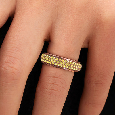 Das ist unser Tara-Ring. Dieser spezielle Typ wird als eternity Ring bezeichnet und ist mit einer durchgehenden Linie von identisch geschliffenen Edelsteinen besetzt. Er ist aus 14 Karat Roségold und mit kleineren 1.3 mm Gelb Saphir besetzt. Die erstaunlichen Gelb Saphir sind identisch in der Größe und im Ringband platziert. Unsere Gelb Saphir werden sorgfältig ausgewählt, damit sie identisch sind und somit das beste Ergebnis erzielen. Um das beste Ergebnis zu erzielen, positioniert unser Juwelier alle Gelb Saphir von Hand und mit größter Sorgfalt. Unsere Juweliere haben nur ein Ziel, nämlich den perfekten Ring zu kreieren. Deshalb lieben wir, was wir tun. Am Ende bekommen Sie einen atemberaubenden, exklusive Roségold Ring mit einer Reihe von Gelb Saphir, die weder Anfang noch Ende zu haben scheinen. Das perfekte Symbol für Ihre unsterbliche Liebe zu ihr! Ist sie nicht eine Schönheit? Nachdem Sie Ihre Bestellung aufgegeben haben, beginnen unsere Goldschmiede mit dem kreativen Prozess der Herstellung Ihres Tara Ring. Wir haben keine Lager. Das ist vorteilhaft, da diese Kosten nicht an Sie weitergegeben werden. Daher sind wir in der Lage, Schmuck zu außergewöhnlich niedrigen Preisen anzubieten.