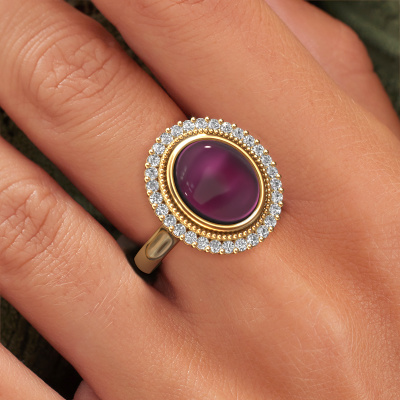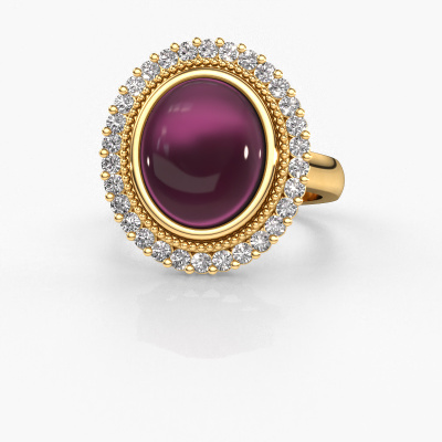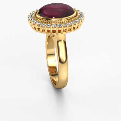 In diesem Foto ist der Gold Mila Ring mit einem 12x10 mm oval cabochon Rhodolit besetzt. Cabochon bedeutet, dass ein Rhodolit zuerst geformt, nicht facettiert wird. Nämlich in eine bestimmte Form wie einen Tropfen, ein Herz oder ein oval cabochon. Anschließend wird er poliert, bis der Edelstein eine Runde Oberfläche hat. Ein Cabochon-Edelstein ist ein atemberaubender, nobler Blickfang, der perfekt zu einem zeitgenössischen wie auch zu einem Vintage-Stil passt. Unsere erfahrenen Goldschmiede formen den Cluster Ring bis zur Perfektion und machen ihn einzigartig. Der Cabochon Rhodolit ist so gefasst, dass seine einzigartigen Qualitäten verstärkt werden. Unsere Goldschmiede kreieren Ihren individuellen Ring leidenschaftlich, mit größter Sorgfalt und nach Ihren Wünschen. Das Gold Ring, wie hier abgebildet, kann mit unserem Online-Tool individuell angepasst werden. Bitte fragen Sie unsere Schmuckdesigner um Hilfe, wenn Sie Änderungen wünsche, die in unserem Online-Tool nicht verfügbar sind. Gerne beantworten wir Ihnen alle offenen Fragen.Durch die Kombination modernster Technik mit uralter Handwerkskunst können wir alle Ringe in unserem eigenen Studio anfertigen. Jedes Schmuckstück wird auf Anfrage gefertigt. Das ist vorteilhaft, weil wir Ihnen dadurch einen Preis anbieten können, den Sie nirgendwo anders finden.Um es einfacher zu machen, bieten wir eine kostenlose 30-tägige Rücksendung.