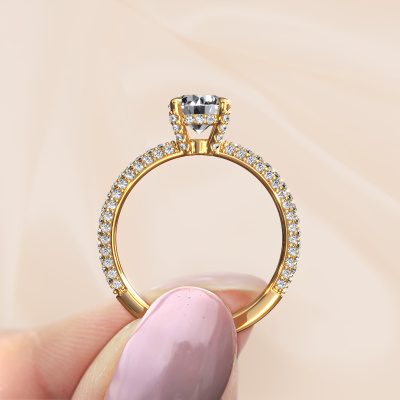 Der oben gezeigte Gold Verlobungsring wird Saskia RND 2 genannt. Es ist ein Pavé Solitär Ring, da er einen zentralen Edelstein und ein Band mit Pavé-Fassung hat. Der exklusive Pavé Solitär Verlobungsring ist in der Kombination 585 Gold mit Gold und ist mit einem rund 1.00 crt Diamant-Mittelstein besetzt und das Band hat eine Pavé-Fassung mit Lab grown Diamant. Jedes Schmuckstück wird hergestellt von einem Team leidenschaftlicher Goldschmiede und Schmuckdesigner. Das wird Ihr Kronjuwel unbedingt zu einem Blickfang machen. Um den zentralen Stein noch mehr zu betonen, hat das Band eine Pavé-Fassung mit weiteren Diamant. Durch die offenen Krappen kann das Licht aus mehreren Winkeln auf den Diamant treffen und der Diamant-Ring funkelt noch mehr. Das obere Foto zeigt die leidenschaftlich handgefertigten Details des Rings. Die hohe Positionierung der Mittelstein ist ein echter Blickfang. Der perfekte Verlobungsring für das Kronjuwel Ihres Lebens!Nach Erhalt Ihrer Bestellung beginnen unsere Goldschmiede mit Leidenschaft den kreativen Prozess und fertigen Ihren Verlobungsring in unserem eigenen Studio. Da wir keine großen Lager haben, werden diese Kosten nicht an Sie weitergegeben. Unsere Preisgestaltung ist der Beweis dafür! Wir bieten Schmuck zum niedrigsten Preis, garantiert.Unser Team fügt unserer Online-Kollektion täglich neue Designs hinzu. Unsere Designer und Goldschmiede arbeiten zusammen, um das beste Design zu kreieren. Wir bemühen uns, eine vielfältige Kollektion von Schmuckstücken anzubieten. Vielleicht haben Sie ein bestimmtes Design im Sinn. Eines, dass Sie irgendwo gesehen haben. Gerne geben wir Ihnen eine kostenlose Beratung. Wir machen Ihnen ein Angebot, basierend auf einem fairen Preis/Leistungsverhältnis, das Sie verblüffen wird.Um es einfacher zu machen, bieten wir eine kostenlose 30-tägige Rücksendung.
