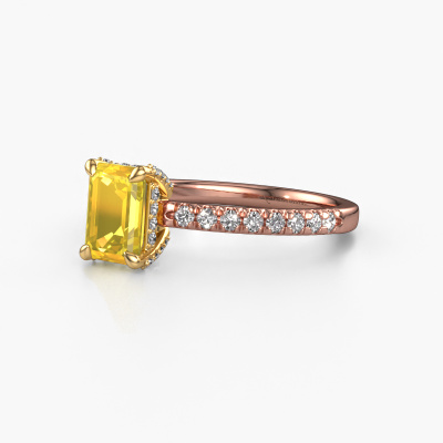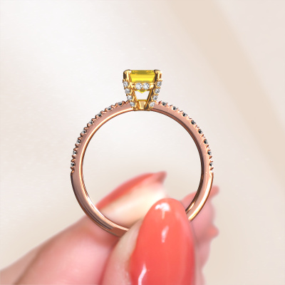 Der oben gezeigte Verlobungsring wird Saskia eme 1 genannt. Wir nennen das einen Solitär-Ring, denn er hat einen einzelnen Edelstein. Es ist ein 14 Karat Roségold ring, mit 7x5 mm smaragd schliff Gelb Saphir. Das Besondere an unserem Konfigurator ist dass Sie selbst einem Schmuckstück zusammenstellen können zu einem eigenen persönlichen Schmuckstück. Dieser Solitäre Verlobungsring ist gefertigt in der Edelmetall Kombination Roségold mit Gold, aber Sie können also auch wählen aus anderen Farben. Jedes Schmuckstück wird hergestellt mit Leidenschaft und Liebe, von einem unserer Meister-Goldschmiede. Der Solitär-Verlobungsring ist eine Sonderform des Verlobungsring. Seine offenen Krappen ermöglichen, dass Licht aus mehr Winkeln auf den Edelstein trifft. Dieser exklusive Verlobungsring ist durch die hohe Positionierung des Edelsteins ein atemberaubender Blickfang. Wir schmücken diesen Solitär-Ring sorgfältig von Hand, damit Sie Ihren Anfrage mit einem einzigartigen Ring würdigen können. Die Liebe Ihres Lebens verdient nur das Beste. Nach Erhalt Ihrer Bestellung beginnen unsere Goldschmiede mit Leidenschaft den kreativen Prozess und fertigen Ihren Verlobungsring in unserem eigenen Studio. Da wir keine großen Lager haben, werden diese Kosten nicht an Sie weitergegeben. Unsere Preisgestaltung ist der Beweis dafür! Wir bieten Schmuck zum niedrigsten Preis, garantiert.Unser Team fügt unserer Online-Kollektion täglich neue Designs hinzu. Unsere Designer und Goldschmiede arbeiten zusammen, um das beste Design zu kreieren. Wir bemühen uns, eine vielfältige Kollektion von Schmuckstücken anzubieten. Vielleicht haben Sie ein bestimmtes Design im Sinn. Eines, dass Sie irgendwo gesehen haben. Gerne geben wir Ihnen eine kostenlose Beratung. Wir machen Ihnen ein Angebot, basierend auf einem fairen Preis/Leistungsverhältnis, das Sie verblüffen wird.Um es einfacher zu machen, bieten wir eine kostenlose 30-tägige Rücksendung.
