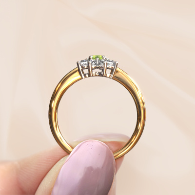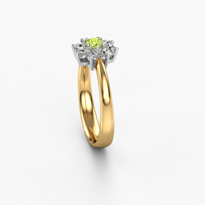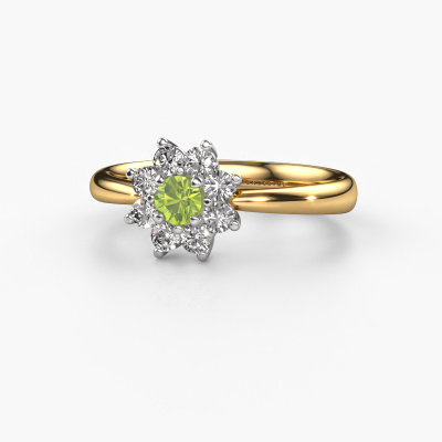 Der oben gezeigte Ring wird Camille 1 genannt. Ein Flower Ring mit einem zentralen Edelstein, umgeben von kleineren Steinen, wir nennen das einen Cluster Ring. Diese Version in 14 Karat Gold hat einen 3.4 mm rund Peridot als Mittelstein, umschlossen von kleineren Diamanten. Der traditionell, Gold Flower Verlobungsring zeichnet sich durch seine Form aus. Zusammen bilden die kleineren und größeren Peridot eine Blume und scheinen zu einem großen, funkelnden Edelstein zu verschmelzen. Dieser traditionell Verlobungsring wird auch als Blumen- oder Rosettenring bezeichnet. Unsere erfahrenen Juweliere stellen sicher, dass die kleineren Diamanten identisch gesetzt sind, so dass es an dem Peridot keine Lichtstörungen gibt, sondern sie stattdessen eine Einheit bilden. Mit perfekter Präzision und geschickter Hand wird jeder Peridot in den Ring gesetzt. Während der Herstellung wird alles ständig überwacht, um sicherzustellen, dass das Licht einwandfrei reflektiert wird. Das alles führt zu einem einzigartigen Verlobungsring mit einem strahlenden Peridot in seiner Mitte. Ein schönes, bedeutungsvolles Geschenk, um es der Liebe Ihres Lebens zu schenken. Mit unserer modernen Technik können wir Schmuckstücke von höchster Qualität mit größter Sorgfalt für Sie entwerfen und anpassen. Unsere Verlobungsringe sind immer um 30 Prozent günstiger als bei anderen Juwelieren. Wir fertigen Verlobungsringe auf Bestellung, also müssen wir keine großen Lager unterhalten. Wenn Sie ein bestimmtes Budget haben, beraten wir Sie gerne entsprechend.Unser Team fügt unserer Online-Kollektion täglich neue Designs hinzu. Unsere Designer und Goldschmiede arbeiten zusammen, um das beste Design zu kreieren. Wir bemühen uns, eine vielfältige Kollektion von Schmuckstücken anzubieten. Vielleicht haben Sie ein bestimmtes Design im Sinn. Eines, dass Sie irgendwo gesehen haben. Gerne geben wir Ihnen eine kostenlose Beratung. Wir machen Ihnen ein Angebot, basierend auf einem fairen Preis/Leistungsverhältnis, das Sie verblüffen wird.Um es einfacher zu machen, bieten wir eine kostenlose 30-tägige Rücksendung.