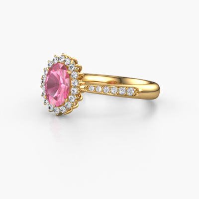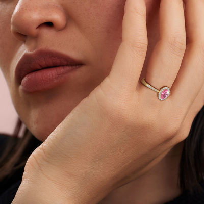 Der oben gezeigte Ring wird Tilly ovl 2 genannt. Ein Cluster Ring mit einem zentralen Edelstein, umgeben von kleineren Steinen, wir nennen das einen Cluster Ring. Diese Version in 14 Karat Gold hat einen 7x5 mm oval Pink Saphir als Mittelstein, umschlossen von kleineren Lab grown Diamant. Wenn Sie einen Gold Cluster Verlobungsring sehen, werden Sie vielleicht den Eindruck bekommen, dass seine kleineren Steine mit dem größeren Pink Saphir aufeinanderprallen. Deshalb ist er wie eine Blume geformt. Deshalb ist dieser Verlobungsring auch als Blumen- oder Rosetten Fassung bekannt. Es ist sehr wichtig, dass die kleineren Lab grown Diamant identisch positioniert sind, so dass es kein Spiel im Licht, sondern eine perfekte Einheit ergibt. Unsere erfahrenen Juweliere erledigen diese Arbeit. Jeder einzelne Stein wird sorgfältig von Hand gesetzt. Während der Herstellung wird der Lichteinfall ständig überwacht. Am Ende bekommen Sie den perfekten Verlobungsring mit einem strahlenden Pink Saphir Edelstein Herzstück. Sie können sich die Wirkung eines solchen Ringes vorstellen, wenn Sie ihn an ihrem besonderen Tag für die Liebe Ihres Lebens zum Leuchten bringen. Mit unserer modernen Technik können wir Schmuckstücke von höchster Qualität mit größter Sorgfalt für Sie entwerfen und anpassen. Unsere Verlobungsringe sind immer um 30 Prozent günstiger als bei anderen Juwelieren. Wir fertigen Verlobungsringe auf Bestellung, also müssen wir keine großen Lager unterhalten. Wenn Sie ein bestimmtes Budget haben, beraten wir Sie gerne entsprechend.Verschiedene Arten von neuen Ringen werden täglich von unserem Team angefertigt. Vielleicht haben Sie irgendwo einen Cluster Verlobungsring gefunden. Einen, den Sie Ihrem Liebsten schenken möchten. Bitte zögern Sie nicht, unseren Schmuckdesignern Ihre Gedanken und Ihr Design zu zeigen. Wir würden gerne Ihr Design in einen klassische Verlobungsring verwandeln. Sie können die Entwicklungen Ihres Ringdesigns verfolgen, da wir sehr detaillierte 3D-Zeichnungen verwenden. Darüber hinaus können Sie einen Dummy des Designs bestellen. Ein Dummy ist ein Kunststoffring, der nach Ihrem Ringdesign gestaltet werden kann. Sie können ihn anprobieren und prüfen, ob der Verlobungsring Ihren Vorstellungen entspricht. Wir senden Ihnen gerne ein unverbindliches Angebot zu einem fairen Preis/Leistungsverhältnis. Das Angebot wird Sie angesichts der Qualität des Rings und der Edelsteine verblüffen.Um es einfacher zu machen, bieten wir eine kostenlose 30-tägige Rücksendung.