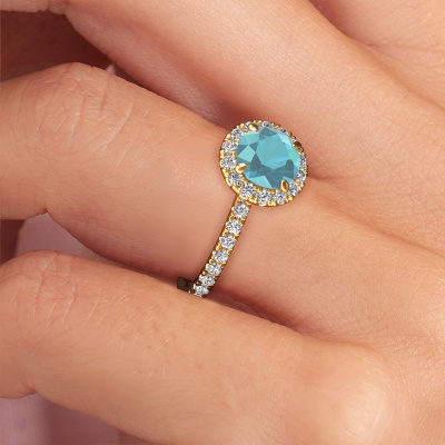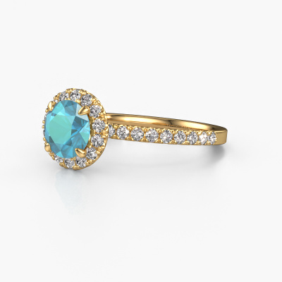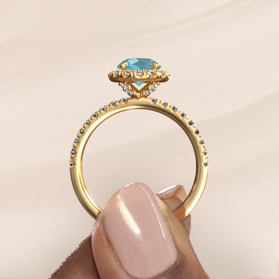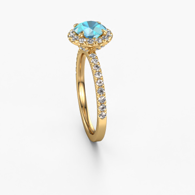 Der oben gezeigte Verlobungsring wird Miranda rnd genannt. Es ist ein Halo Ring, da er einen zentralen Edelstein und ein Band mit Pavé-Fassung hat. Der 14 Karat Gold ring ist mit einem 6.5 mm rund Blau Topas-Mittelstein besetzt und um ihn herum eine Pavé-Fassung mit Lab grown Diamant. Was diesen exklusive, Gold Halo Ring besonders macht, sind die kleineren Steine, die den zentralen Stein umschließen. Dieser wunderschöne Verlobungsring wird als Halo Ring bezeichnet, da die kleineren Edelsteine dem zentralen Stein einen Lichthof geben. Damit die kleineren Steine den Mittelstein verstärken, müssen sie so platziert werden, dass keine Lichteinflüsse auftreten. Und hier kommen unsere erfahrenen Goldschmiede ins Spiel. Jeder einzelne Stein wird sorgfältig von Hand in den Ring gesetzt. Während der Herstellung wird der Lichteinfall ständig überprüft. So können wir sicherstellen, dass der spezielle Lichtkranz noch sichtbar ist. Am Ende erhalten Sie einen einzigartigen Verlobungsring mit einem Blaue Topas Ihrer Wahl in der Mitte. Sie können sich die Wirkung eines solchen Ringes vorstellen, wenn Sie ihn an ihrem besonderen Tag für sie zum Leuchten bringen. Mit unserer modernen Technik können wir Schmuckstücke von höchster Qualität mit größter Sorgfalt für Sie entwerfen und anpassen. Unsere Verlobungsringe sind immer um 30 Prozent günstiger als bei anderen Juwelieren. Wir fertigen Verlobungsringe auf Bestellung, also müssen wir keine großen Lager unterhalten. Wenn Sie ein bestimmtes Budget haben, beraten wir Sie gerne entsprechend.Haben Sie irgendwo einen bestimmten Verlobungsring gefunden, den Sie Ihrem Liebsten schenken möchten? Sie können uns gerne sagen, was Sie wollen und wir werden Ihr Design in einen Einzigartigen exklusive Verlobungsring verwandeln. Sie können die Entwicklungen Ihres Ringdesigns verfolgen, da wir 3D-Zeichnungen verwenden. Das gibt Ihnen eine realistische Vorschau, wie Ihr Design aussehen wird. Sie können auch einen Dummy vorbestellen. Ein Dummy ist ein Kunststoffring, der nach Ihrem Ringdesign gestaltet werden kann. Sie können ihn anprobieren und prüfen, ob seine Breite und Größe für Sie geeignet sind. Wir senden Ihnen gerne ein unverbindliches Angebot zu einem fairen Preis/Leistungsverhältnis. Sie werden in Anbetracht der Qualität des Rings und der Edelsteine überrascht sein.Um es einfacher zu machen, bieten wir eine kostenlose 30-tägige Rücksendung.
