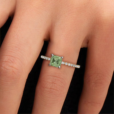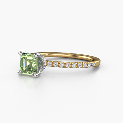 Der oben gezeigte Gold Verlobungsring wird Crystal ASSC 4 genannt. Es ist ein Pavé Solitär Ring, da er einen zentralen Edelstein und ein Band mit Pavé-Fassung hat. Der exklusive Pavé Solitär Verlobungsring ist in der Kombination 585 Gold mit Weißgold und ist mit einem asscher 5.5 mm grüner Labor-Diamant-Mittelstein besetzt und das Band hat eine Pavé-Fassung mit Diamanten. Jedes Schmuckstück wird hergestellt mit Leidenschaft und Liebe, von einem unserer Meister-Goldschmiede. Um den zentralen Stein noch mehr zu betonen, hat das Band eine Pavé-Fassung mit weiteren grüner Labor-Diamant. Durch die offenen Krappen kann das Licht aus mehreren Winkeln auf den grüner Labor-Diamant treffen und der grüner Labor-Diamant-Ring funkelt noch mehr. Das obere Foto zeigt die leidenschaftlich handgefertigten Details des Rings. Die hohe Positionierung der Mittelstein ist ein echter Blickfang. Der perfekte Verlobungsring für das Kronjuwel Ihres Lebens!Durch die Kombination modernster Technik mit uralter Handwerkskunst können wir alle Verlobungsringe in unserem eigenen Studio anfertigen. Jedes Schmuckstück wird auf Anfrage gefertigt. Das ist vorteilhaft, weil wir Ihnen dadurch einen Preis anbieten können, den Sie nirgendwo anders finden.Unser Team fügt unserer Online-Kollektion täglich neue Designs hinzu. Unsere Designer und Goldschmiede arbeiten zusammen, um das beste Design zu kreieren. Wir bemühen uns, eine vielfältige Kollektion von Schmuckstücken anzubieten. Vielleicht haben Sie ein bestimmtes Design im Sinn. Eines, dass Sie irgendwo gesehen haben. Gerne geben wir Ihnen eine kostenlose Beratung. Wir machen Ihnen ein Angebot, basierend auf einem fairen Preis/Leistungsverhältnis, das Sie verblüffen wird.Um es einfacher zu machen, bieten wir eine kostenlose 30-tägige Rücksendung.