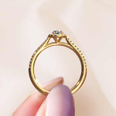 Der oben gezeigte Verlobungsring wird Seline rnd 2 genannt. Es ist ein Halo Ring, da er einen zentralen Edelstein und ein Band mit Pavé-Fassung hat. Der 585 Gold ring ist mit einem 0.30 crt rund Diamant-Mittelstein besetzt und um ihn herum eine Pavé-Fassung mit Lab grown Diamant. Was diesen exklusive, Gold Halo Ring besonders macht, sind die kleineren Steine, die den zentralen Stein umschließen. Dieser wunderschöne Verlobungsring wird als Halo Ring bezeichnet, da die kleineren Edelsteine dem zentralen Stein einen Lichthof geben. Damit die kleineren Steine den Mittelstein verstärken, müssen sie so platziert werden, dass keine Lichteinflüsse auftreten. Und hier kommen unsere erfahrenen Goldschmiede ins Spiel. Jeder einzelne Stein wird sorgfältig von Hand in den Ring gesetzt. Während der Herstellung wird der Lichteinfall ständig überprüft. So können wir sicherstellen, dass der spezielle Lichtkranz noch sichtbar ist. Am Ende erhalten Sie einen einzigartigen Verlobungsring mit einem Diamanten Ihrer Wahl in der Mitte. Sie können sich die Wirkung eines solchen Ringes vorstellen, wenn Sie ihn an ihrem besonderen Tag für sie zum Leuchten bringen. Nachdem Sie Ihre Bestellung aufgegeben haben, beginnen unsere Goldschmiede mit dem kreativen Prozess der Herstellung Ihres Seline rnd 2 Verlobungsring. Wir haben keine Lager. Das ist vorteilhaft, da diese Kosten nicht an Sie weitergegeben werden. Daher sind wir in der Lage, Schmuck zu außergewöhnlich niedrigen Preisen anzubieten.Unser Team fügt unserer Online-Kollektion täglich neue Designs hinzu. Unsere Designer und Goldschmiede arbeiten zusammen, um das beste Design zu kreieren. Wir bemühen uns, eine vielfältige Kollektion von Schmuckstücken anzubieten. Vielleicht haben Sie ein bestimmtes Design im Sinn. Eines, dass Sie irgendwo gesehen haben. Gerne geben wir Ihnen eine kostenlose Beratung. Wir machen Ihnen ein Angebot, basierend auf einem fairen Preis/Leistungsverhältnis, das Sie verblüffen wird.Um es einfacher zu machen, bieten wir eine kostenlose 30-tägige Rücksendung.