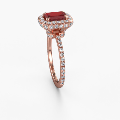 Der oben gezeigte Verlobungsring wird Talitha EME genannt. Es ist ein Halo Ring, da er einen zentralen Edelstein und ein Band mit Pavé-Fassung hat. Der 14 Karat Roségold ring ist mit einem 7x5 mm smaragd schliff Rubin-Mittelstein besetzt und um ihn herum eine Pavé-Fassung mit Lab grown Diamant. Was diesen Luxus, Roségold Halo Ring besonders macht, sind die kleineren Steine, die den zentralen Stein umschließen. Dieser wunderschöne Verlobungsring wird als Halo Ring bezeichnet, da die kleineren Edelsteine dem zentralen Stein einen Lichthof geben. Damit die kleineren Steine den Mittelstein verstärken, müssen sie so platziert werden, dass keine Lichteinflüsse auftreten. Und hier kommen unsere erfahrenen Goldschmiede ins Spiel. Jeder einzelne Stein wird sorgfältig von Hand in den Ring gesetzt. Während der Herstellung wird der Lichteinfall ständig überprüft. So können wir sicherstellen, dass der spezielle Lichtkranz noch sichtbar ist. Am Ende erhalten Sie einen einzigartigen Verlobungsring mit einem Rubin Ihrer Wahl in der Mitte. Sie können sich die Wirkung eines solchen Ringes vorstellen, wenn Sie ihn an ihrem besonderen Tag für sie zum Leuchten bringen. Mit unserer modernen Technik können wir Schmuckstücke von höchster Qualität mit größter Sorgfalt für Sie entwerfen und anpassen. Unsere Verlobungsringe sind immer um 30 Prozent günstiger als bei anderen Juwelieren. Wir fertigen Verlobungsringe auf Bestellung, also müssen wir keine großen Lager unterhalten. Wenn Sie ein bestimmtes Budget haben, beraten wir Sie gerne entsprechend.Unser Team fügt unserer Online-Kollektion täglich neue Designs hinzu. Unsere Designer und Goldschmiede arbeiten zusammen, um das beste Design zu kreieren. Wir bemühen uns, eine vielfältige Kollektion von Schmuckstücken anzubieten. Vielleicht haben Sie ein bestimmtes Design im Sinn. Eines, dass Sie irgendwo gesehen haben. Gerne geben wir Ihnen eine kostenlose Beratung. Wir machen Ihnen ein Angebot, basierend auf einem fairen Preis/Leistungsverhältnis, das Sie verblüffen wird.Um es einfacher zu machen, bieten wir eine kostenlose 30-tägige Rücksendung.