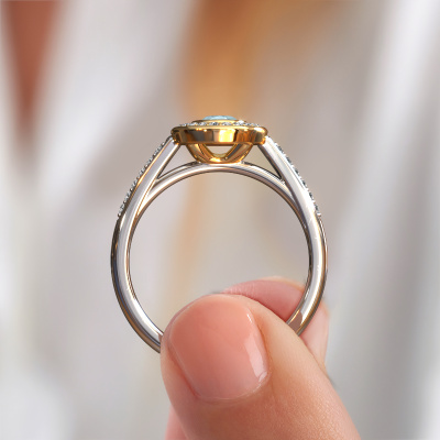 Der oben gezeigte Verlobungsring wird Noud 2 OVL genannt. Es ist ein Halo Ring, da er einen zentralen Edelstein und ein Band mit Pavé-Fassung hat. Der 14 Karat Weißgold ring ist mit einem 6x4 mm oval Aquamarin-Mittelstein besetzt und um ihn herum eine Pavé-Fassung mit Lab grown Diamant. Was diesen exklusive, Weißgold Halo Ring besonders macht, sind die kleineren Steine, die den zentralen Stein umschließen. Dieser wunderschöne Verlobungsring wird als Halo Ring bezeichnet, da die kleineren Edelsteine dem zentralen Stein einen Lichthof geben. Damit die kleineren Steine den Mittelstein verstärken, müssen sie so platziert werden, dass keine Lichteinflüsse auftreten. Und hier kommen unsere erfahrenen Goldschmiede ins Spiel. Jeder einzelne Stein wird sorgfältig von Hand in den Ring gesetzt. Während der Herstellung wird der Lichteinfall ständig überprüft. So können wir sicherstellen, dass der spezielle Lichtkranz noch sichtbar ist. Am Ende erhalten Sie einen einzigartigen Verlobungsring mit einem Aquamarins Ihrer Wahl in der Mitte. Sie können sich die Wirkung eines solchen Ringes vorstellen, wenn Sie ihn an ihrem besonderen Tag für sie zum Leuchten bringen. Mit unserer modernen Technik können wir Schmuckstücke von höchster Qualität mit größter Sorgfalt für Sie entwerfen und anpassen. Unsere Verlobungsringe sind immer um 30 Prozent günstiger als bei anderen Juwelieren. Wir fertigen Verlobungsringe auf Bestellung, also müssen wir keine großen Lager unterhalten. Wenn Sie ein bestimmtes Budget haben, beraten wir Sie gerne entsprechend.Haben Sie irgendwo einen bestimmten Verlobungsring gefunden, den Sie Ihrem Liebsten schenken möchten? Sie können uns gerne sagen, was Sie wollen und wir werden Ihr Design in einen Einzigartigen exklusive Verlobungsring verwandeln. Sie können die Entwicklungen Ihres Ringdesigns verfolgen, da wir 3D-Zeichnungen verwenden. Das gibt Ihnen eine realistische Vorschau, wie Ihr Design aussehen wird. Sie können auch einen Dummy vorbestellen. Ein Dummy ist ein Kunststoffring, der nach Ihrem Ringdesign gestaltet werden kann. Sie können ihn anprobieren und prüfen, ob seine Breite und Größe für Sie geeignet sind. Wir senden Ihnen gerne ein unverbindliches Angebot zu einem fairen Preis/Leistungsverhältnis. Sie werden in Anbetracht der Qualität des Rings und der Edelsteine überrascht sein.Um es einfacher zu machen, bieten wir eine kostenlose 30-tägige Rücksendung.