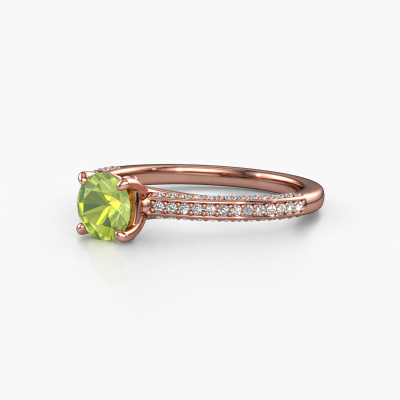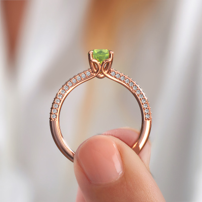 Der oben gezeigte Ring wird Elenore rnd genannt. Es ist ein Pavé Solitär Ring, da er einen zentralen Edelstein und ein Band mit Pavé-Fassung hat. Dieser 14 Karat Roségold ring ist mit einem 5.4 mm rund Peridot-Mittelstein besetzt und das Band hat eine Pavé-Fassung mit Lab grown Diamant. Jedes Schmuckstück wird von unseren Meister-Goldschmieden in unserem eigenen Studio für Sie gefertigt.Dieser exklusive Roségold Pavé Solitär Verlobungsring mit Pavé-Fassung hat einen exquisiten, rund Peridot als Mittelstein. Um den zentralen Stein noch mehr zu betonen, hat das Band eine Pavé-Fassung mit weiteren Lab grown Diamant. Durch die offenen Krappen kann das Licht aus mehreren Winkeln auf den Peridot treffen und der Peridot-Ring funkelt noch mehr. Das obere Foto zeigt die leidenschaftlich handgefertigten Details des Rings. Die hohe Positionierung der Mittelstein ist ein echter Blickfang. Der perfekte Verlobungsring für das Kronjuwel Ihres Lebens!Durch die Kombination modernster Technik mit uralter Handwerkskunst können wir alle Verlobungsringe in unserem eigenen Studio anfertigen. Jedes Schmuckstück wird auf Anfrage gefertigt. Das ist vorteilhaft, weil wir Ihnen dadurch einen Preis anbieten können, den Sie nirgendwo anders finden.Haben Sie irgendwo einen bestimmten Verlobungsring gefunden, den Sie Ihrem Liebsten schenken möchten? Sie können uns gerne sagen, was Sie wollen und wir werden Ihr Design in einen Einzigartigen exklusive Verlobungsring verwandeln. Sie können die Entwicklungen Ihres Ringdesigns verfolgen, da wir 3D-Zeichnungen verwenden. Das gibt Ihnen eine realistische Vorschau, wie Ihr Design aussehen wird. Sie können auch einen Dummy vorbestellen. Ein Dummy ist ein Kunststoffring, der nach Ihrem Ringdesign gestaltet werden kann. Sie können ihn anprobieren und prüfen, ob seine Breite und Größe für Sie geeignet sind. Wir senden Ihnen gerne ein unverbindliches Angebot zu einem fairen Preis/Leistungsverhältnis. Sie werden in Anbetracht der Qualität des Rings und der Edelsteine überrascht sein.Um es einfacher zu machen, bieten wir eine kostenlose 30-tägige Rücksendung.
