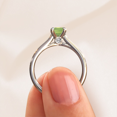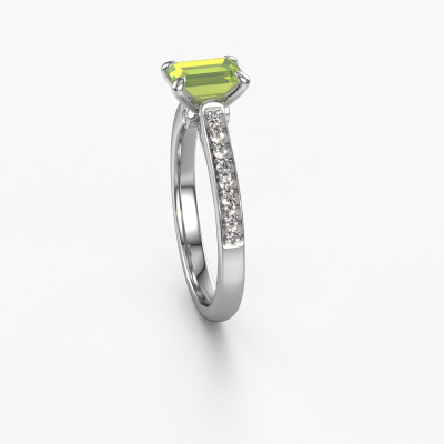 Der oben gezeigte Weißgold Verlobungsring wird Valorie eme 2 genannt. Es ist ein Pavé Solitär Ring, da er einen zentralen Edelstein und ein Band mit Pavé-Fassung hat. Der klassische Pavé Solitär Verlobungsring ist in der Kombination 14 Karat Weißgold mit Weißgold und ist mit einem smaragd schliff 6.5x4.5 mm Peridot-Mittelstein besetzt und das Band hat eine Pavé-Fassung mit Diamanten. Jedes Schmuckstück wird hergestellt von einem Team leidenschaftlicher Goldschmiede und Schmuckdesigner. Das wird Ihr Kronjuwel unbedingt zu einem Blickfang machen. Um den zentralen Stein noch mehr zu betonen, hat das Band eine Pavé-Fassung mit weiteren Peridot. Durch die offenen Krappen kann das Licht aus mehreren Winkeln auf den Peridot treffen und der Peridot-Ring funkelt noch mehr. Das obere Foto zeigt die leidenschaftlich handgefertigten Details des Rings. Die hohe Positionierung der Mittelstein ist ein echter Blickfang. Der perfekte Verlobungsring für das Kronjuwel Ihres Lebens!Mit unserer modernen Technik können wir Schmuckstücke von höchster Qualität mit größter Sorgfalt für Sie entwerfen und anpassen. Unsere Verlobungsringe sind immer um 30 Prozent günstiger als bei anderen Juwelieren. Wir fertigen Verlobungsringe auf Bestellung, also müssen wir keine großen Lager unterhalten. Wenn Sie ein bestimmtes Budget haben, beraten wir Sie gerne entsprechend.Haben Sie irgendwo einen bestimmten Verlobungsring gefunden, den Sie Ihrem Liebsten schenken möchten? Sie können uns gerne sagen, was Sie wollen und wir werden Ihr Design in einen Einzigartigen klassische Verlobungsring verwandeln. Sie können die Entwicklungen Ihres Ringdesigns verfolgen, da wir 3D-Zeichnungen verwenden. Das gibt Ihnen eine realistische Vorschau, wie Ihr Design aussehen wird. Sie können auch einen Dummy vorbestellen. Ein Dummy ist ein Kunststoffring, der nach Ihrem Ringdesign gestaltet werden kann. Sie können ihn anprobieren und prüfen, ob seine Breite und Größe für Sie geeignet sind. Wir senden Ihnen gerne ein unverbindliches Angebot zu einem fairen Preis/Leistungsverhältnis. Sie werden in Anbetracht der Qualität des Rings und der Edelsteine überrascht sein.Um es einfacher zu machen, bieten wir eine kostenlose 30-tägige Rücksendung.