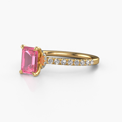 Der oben gezeigte Gold Verlobungsring wird Crystal EME 4 genannt. Es ist ein Pavé Solitär Ring, da er einen zentralen Edelstein und ein Band mit Pavé-Fassung hat. Der modische Pavé Solitär Verlobungsring ist in der Kombination 14 Karat Gold mit Gold und ist mit einem smaragd schliff 7x5 mm Pink Saphir-Mittelstein besetzt und das Band hat eine Pavé-Fassung mit Lab grown Diamant. Jedes Schmuckstück ist um Ihrem Finger Glanz zu verleihen. Jeder Ring wird von unseren Goldschmieden liebevoll von Hand gefertigt. Um den zentralen Stein noch mehr zu betonen, hat das Band eine Pavé-Fassung mit weiteren Pink Saphir. Durch die offenen Krappen kann das Licht aus mehreren Winkeln auf den Pink Saphir treffen und der Pink Saphir-Ring funkelt noch mehr. Das obere Foto zeigt die leidenschaftlich handgefertigten Details des Rings. Die hohe Positionierung der Mittelstein ist ein echter Blickfang. Der perfekte Verlobungsring für das Kronjuwel Ihres Lebens!Nach Erhalt Ihrer Bestellung beginnen unsere Goldschmiede mit Leidenschaft den kreativen Prozess und fertigen Ihren Verlobungsring in unserem eigenen Studio. Da wir keine großen Lager haben, werden diese Kosten nicht an Sie weitergegeben. Unsere Preisgestaltung ist der Beweis dafür! Wir bieten Schmuck zum niedrigsten Preis, garantiert.Unser Team fügt unserer Online-Kollektion täglich neue Designs hinzu. Unsere Designer und Goldschmiede arbeiten zusammen, um das beste Design zu kreieren. Wir bemühen uns, eine vielfältige Kollektion von Schmuckstücken anzubieten. Vielleicht haben Sie ein bestimmtes Design im Sinn. Eines, dass Sie irgendwo gesehen haben. Gerne geben wir Ihnen eine kostenlose Beratung. Wir machen Ihnen ein Angebot, basierend auf einem fairen Preis/Leistungsverhältnis, das Sie verblüffen wird.Um es einfacher zu machen, bieten wir eine kostenlose 30-tägige Rücksendung.