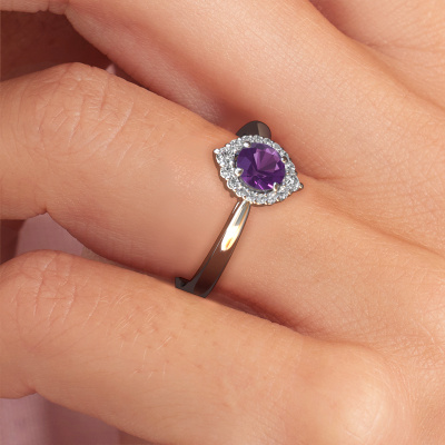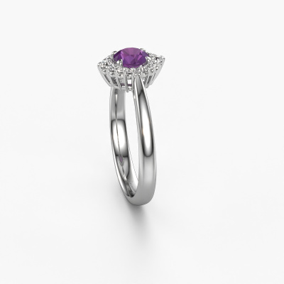 Der oben gezeigte Ring wird Tora genannt. Ein Cluster Ring mit einem zentralen Edelstein, umgeben von kleineren Steinen, wir nennen das einen Cluster Ring. Diese Version in Platin hat einen 5 mm rund Amethyst als Mittelstein, umschlossen von kleineren Lab grown Diamant. Der klassische, Platin Cluster Verlobungsring zeichnet sich durch seine Form aus. Zusammen bilden die kleineren und größeren Amethyst eine Blume und scheinen zu einem großen, funkelnden Edelstein zu verschmelzen. Dieser klassische Verlobungsring wird auch als Blumen- oder Rosettenring bezeichnet. Unsere erfahrenen Juweliere stellen sicher, dass die kleineren Lab grown Diamant identisch gesetzt sind, so dass es an dem Amethyst keine Lichtstörungen gibt, sondern sie stattdessen eine Einheit bilden. Mit perfekter Präzision und geschickter Hand wird jeder Amethyst in den Ring gesetzt. Während der Herstellung wird alles ständig überwacht, um sicherzustellen, dass das Licht einwandfrei reflektiert wird. Das alles führt zu einem einzigartigen Verlobungsring mit einem strahlenden Amethysten in seiner Mitte. Ein schönes, bedeutungsvolles Geschenk, um es der Liebe Ihres Lebens zu schenken. Durch die Kombination modernster Technik mit uralter Handwerkskunst können wir alle Verlobungsringe in unserem eigenen Studio anfertigen. Jedes Schmuckstück wird auf Anfrage gefertigt. Das ist vorteilhaft, weil wir Ihnen dadurch einen Preis anbieten können, den Sie nirgendwo anders finden.Haben Sie irgendwo einen bestimmten Verlobungsring gefunden, den Sie Ihrem Liebsten schenken möchten? Sie können uns gerne sagen, was Sie wollen und wir werden Ihr Design in einen Einzigartigen klassische Verlobungsring verwandeln. Sie können die Entwicklungen Ihres Ringdesigns verfolgen, da wir 3D-Zeichnungen verwenden. Das gibt Ihnen eine realistische Vorschau, wie Ihr Design aussehen wird. Sie können auch einen Dummy vorbestellen. Ein Dummy ist ein Kunststoffring, der nach Ihrem Ringdesign gestaltet werden kann. Sie können ihn anprobieren und prüfen, ob seine Breite und Größe für Sie geeignet sind. Wir senden Ihnen gerne ein unverbindliches Angebot zu einem fairen Preis/Leistungsverhältnis. Sie werden in Anbetracht der Qualität des Rings und der Edelsteine überrascht sein.Um es einfacher zu machen, bieten wir eine kostenlose 30-tägige Rücksendung.