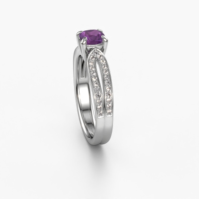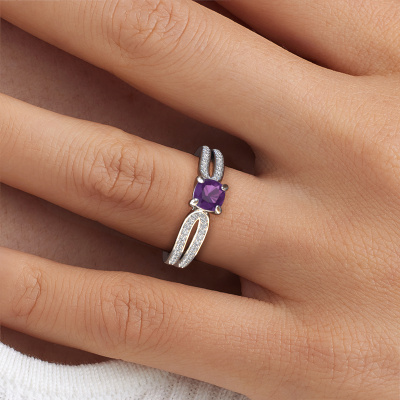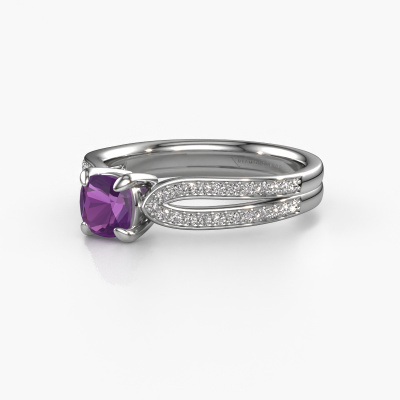Der oben gezeigte Platin Verlobungsring wird Antonia cus 2 genannt. Es ist ein Pavé Solitär Ring, da er einen zentralen Edelstein und ein Band mit Pavé-Fassung hat. Der Fantasie Pavé Solitär Verlobungsring ist in der Kombination Platin mit Platin und ist mit einem cussion 5 mm Amethyst-Mittelstein besetzt und das Band hat eine Pavé-Fassung mit Lab grown Diamant. Jedes Schmuckstück wird von unseren Meister-Goldschmieden in unserem eigenen Studio für Sie gefertigt. Um den zentralen Stein noch mehr zu betonen, hat das Band eine Pavé-Fassung mit weiteren Amethyst. Durch die offenen Krappen kann das Licht aus mehreren Winkeln auf den Amethyst treffen und der Amethyst-Ring funkelt noch mehr. Das obere Foto zeigt die leidenschaftlich handgefertigten Details des Rings. Die hohe Positionierung der Mittelstein ist ein echter Blickfang. Der perfekte Verlobungsring für das Kronjuwel Ihres Lebens!Mit unserer modernen Technik können wir Schmuckstücke von höchster Qualität mit größter Sorgfalt für Sie entwerfen und anpassen. Unsere Verlobungsringe sind immer um 30 Prozent günstiger als bei anderen Juwelieren. Wir fertigen Verlobungsringe auf Bestellung, also müssen wir keine großen Lager unterhalten. Wenn Sie ein bestimmtes Budget haben, beraten wir Sie gerne entsprechend.Haben Sie irgendwo einen bestimmten Verlobungsring gefunden, den Sie Ihrem Liebsten schenken möchten? Sie können uns gerne sagen, was Sie wollen und wir werden Ihr Design in einen Einzigartigen Fantasie Verlobungsring verwandeln. Sie können die Entwicklungen Ihres Ringdesigns verfolgen, da wir 3D-Zeichnungen verwenden. Das gibt Ihnen eine realistische Vorschau, wie Ihr Design aussehen wird. Sie können auch einen Dummy vorbestellen. Ein Dummy ist ein Kunststoffring, der nach Ihrem Ringdesign gestaltet werden kann. Sie können ihn anprobieren und prüfen, ob seine Breite und Größe für Sie geeignet sind. Wir senden Ihnen gerne ein unverbindliches Angebot zu einem fairen Preis/Leistungsverhältnis. Sie werden in Anbetracht der Qualität des Rings und der Edelsteine überrascht sein.Um es einfacher zu machen, bieten wir eine kostenlose 30-tägige Rücksendung.