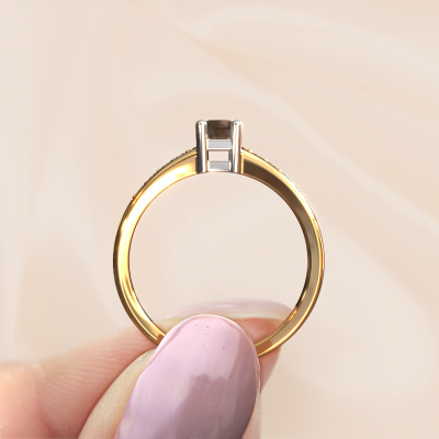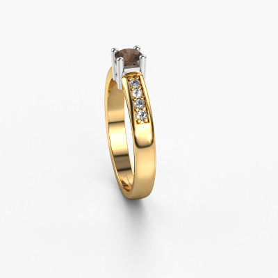 Der oben gezeigte Gold Verlobungsring wird Eline 2 genannt. Es ist ein Pavé Solitär Ring, da er einen zentralen Edelstein und ein Band mit Pavé-Fassung hat. Der moderne Pavé Solitär Verlobungsring ist in der Kombination 14 Karat Gold mit Weißgold und ist mit einem rund 3.7 mm Rauchquarz-Mittelstein besetzt und das Band hat eine Pavé-Fassung mit Diamanten. Jedes Schmuckstück ist einzigartig in jeder Hinsicht! Einfach nach Ihren Wünschen anzupassen. Um den zentralen Stein noch mehr zu betonen, hat das Band eine Pavé-Fassung mit weiteren Rauchquarz. Durch die offenen Krappen kann das Licht aus mehreren Winkeln auf den Rauchquarz treffen und der Rauchquarz-Ring funkelt noch mehr. Das obere Foto zeigt die leidenschaftlich handgefertigten Details des Rings. Die hohe Positionierung der Mittelstein ist ein echter Blickfang. Der perfekte Verlobungsring für das Kronjuwel Ihres Lebens!Da wir unsere eigenen Ringe entwerfen und liefern, können wir Ihnen einen Verlobungsring zu einem Preis anbieten, den Sie nirgendwo anders finden. Ein Ring wird auf Bestellung angefertigt, wodurch kein überschüssiges Material anfällt. So können wir Ihnen ein gutes Angebot zum besten Preis machen. Wir verstehen, dass es sich riskant anfühlt, Ihren Verlobungsring online zu kaufen. Jedoch helfen wir Ihnen gerne beim Designprozess unter Berücksichtigung Ihres Budgets.Unser Team fügt unserer Online-Kollektion täglich neue Designs hinzu. Unsere Designer und Goldschmiede arbeiten zusammen, um das beste Design zu kreieren. Wir bemühen uns, eine vielfältige Kollektion von Schmuckstücken anzubieten. Vielleicht haben Sie ein bestimmtes Design im Sinn. Eines, dass Sie irgendwo gesehen haben. Gerne geben wir Ihnen eine kostenlose Beratung. Wir machen Ihnen ein Angebot, basierend auf einem fairen Preis/Leistungsverhältnis, das Sie verblüffen wird.Um es einfacher zu machen, bieten wir eine kostenlose 30-tägige Rücksendung.