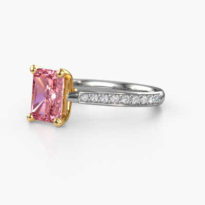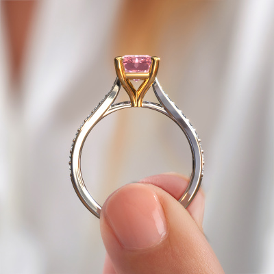 Der oben gezeigte Weißgold Verlobungsring wird Mignon RAD 2 genannt. Es ist ein Pavé Solitär Ring, da er einen zentralen Edelstein und ein Band mit Pavé-Fassung hat. Der traditionell Pavé Solitär Verlobungsring ist in der Kombination 585 Weißgold mit Gold und ist mit einem radiant 8x6 mm rosa Labordiamant-Mittelstein besetzt und das Band hat eine Pavé-Fassung mit Lab grown Diamant. Jedes Schmuckstück ist einzigartig in jeder Hinsicht! Einfach nach Ihren Wünschen anzupassen. Um den zentralen Stein noch mehr zu betonen, hat das Band eine Pavé-Fassung mit weiteren rosa Labordiamant. Durch die offenen Krappen kann das Licht aus mehreren Winkeln auf den rosa Labordiamant treffen und der rosa Labordiamant-Ring funkelt noch mehr. Das obere Foto zeigt die leidenschaftlich handgefertigten Details des Rings. Die hohe Positionierung der Mittelstein ist ein echter Blickfang. Der perfekte Verlobungsring für das Kronjuwel Ihres Lebens!Haben Sie ein bestimmtes Budget? Sie können uns gerne kontaktieren, damit wir Ihre Optionen besprechen können. Wir bieten unsere Verlobungsringe zum garantiert besten Preis, denn wir fertigen sie auf Bestellung. Solche Preise finden Sie nirgendwo anders!Haben Sie irgendwo einen bestimmten Verlobungsring gefunden, den Sie Ihrem Liebsten schenken möchten? Sie können uns gerne sagen, was Sie wollen und wir werden Ihr Design in einen Einzigartigen traditionell Verlobungsring verwandeln. Sie können die Entwicklungen Ihres Ringdesigns verfolgen, da wir 3D-Zeichnungen verwenden. Das gibt Ihnen eine realistische Vorschau, wie Ihr Design aussehen wird. Sie können auch einen Dummy vorbestellen. Ein Dummy ist ein Kunststoffring, der nach Ihrem Ringdesign gestaltet werden kann. Sie können ihn anprobieren und prüfen, ob seine Breite und Größe für Sie geeignet sind. Wir senden Ihnen gerne ein unverbindliches Angebot zu einem fairen Preis/Leistungsverhältnis. Sie werden in Anbetracht der Qualität des Rings und der Edelsteine überrascht sein.Um es einfacher zu machen, bieten wir eine kostenlose 30-tägige Rücksendung.
