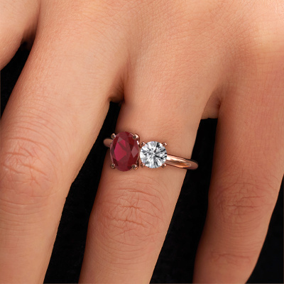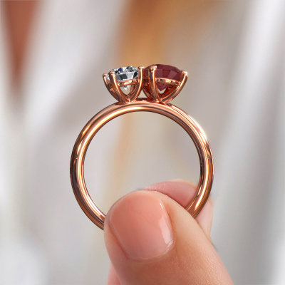 Dieser Verlobungsring aus 14 Karat Roségold heißt Toi et Moi OVL-RND. Suchen Sie nach einem einzigartigen Roségold Verlobungsring mit einem trendigen Aussehen? Dann ist dieser Ring mit Rubin das Richtige für Sie. Einfach nach Ihren Wünschen
