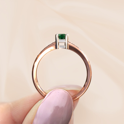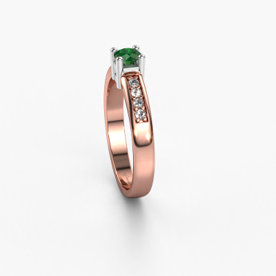 Der oben gezeigte Roségold Verlobungsring wird Eline 2 genannt. Es ist ein Pavé Solitär Ring, da er einen zentralen Edelstein und ein Band mit Pavé-Fassung hat. Der moderne Pavé Solitär Verlobungsring ist in der Kombination 14 Karat Roségold mit Weißgold und ist mit einem rund 3.7 mm Smaragd-Mittelstein besetzt und das Band hat eine Pavé-Fassung mit Diamanten. Jedes Schmuckstück ist einzigartig in jeder Hinsicht! Einfach nach Ihren Wünschen anzupassen. Um den zentralen Stein noch mehr zu betonen, hat das Band eine Pavé-Fassung mit weiteren Smaragd. Durch die offenen Krappen kann das Licht aus mehreren Winkeln auf den Smaragd treffen und der Smaragd-Ring funkelt noch mehr. Das obere Foto zeigt die leidenschaftlich handgefertigten Details des Rings. Die hohe Positionierung der Mittelstein ist ein echter Blickfang. Der perfekte Verlobungsring für das Kronjuwel Ihres Lebens!Da wir unsere eigenen Ringe entwerfen und liefern, können wir Ihnen einen Verlobungsring zu einem Preis anbieten, den Sie nirgendwo anders finden. Ein Ring wird auf Bestellung angefertigt, wodurch kein überschüssiges Material anfällt. So können wir Ihnen ein gutes Angebot zum besten Preis machen. Wir verstehen, dass es sich riskant anfühlt, Ihren Verlobungsring online zu kaufen. Jedoch helfen wir Ihnen gerne beim Designprozess unter Berücksichtigung Ihres Budgets.Unser Team fügt unserer Online-Kollektion täglich neue Designs hinzu. Unsere Designer und Goldschmiede arbeiten zusammen, um das beste Design zu kreieren. Wir bemühen uns, eine vielfältige Kollektion von Schmuckstücken anzubieten. Vielleicht haben Sie ein bestimmtes Design im Sinn. Eines, dass Sie irgendwo gesehen haben. Gerne geben wir Ihnen eine kostenlose Beratung. Wir machen Ihnen ein Angebot, basierend auf einem fairen Preis/Leistungsverhältnis, das Sie verblüffen wird.Um es einfacher zu machen, bieten wir eine kostenlose 30-tägige Rücksendung.