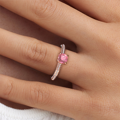 Der oben gezeigte Ring wird Elenore rnd genannt. Es ist ein Pavé Solitär Ring, da er einen zentralen Edelstein und ein Band mit Pavé-Fassung hat. Dieser 14 Karat Roségold ring ist mit einem 5.4 mm rund Turmalin rosa-Mittelstein besetzt und das Band hat eine Pavé-Fassung mit Lab grown Diamant. Jedes Schmuckstück wird von unseren Meister-Goldschmieden in unserem eigenen Studio für Sie gefertigt.Dieser exklusive Roségold Pavé Solitär Verlobungsring mit Pavé-Fassung hat einen exquisiten, rund Turmalin rosa als Mittelstein. Um den zentralen Stein noch mehr zu betonen, hat das Band eine Pavé-Fassung mit weiteren Lab grown Diamant. Durch die offenen Krappen kann das Licht aus mehreren Winkeln auf den Turmalin rosa treffen und der Turmalin rosa-Ring funkelt noch mehr. Das obere Foto zeigt die leidenschaftlich handgefertigten Details des Rings. Die hohe Positionierung der Mittelstein ist ein echter Blickfang. Der perfekte Verlobungsring für das Kronjuwel Ihres Lebens!Durch die Kombination modernster Technik mit uralter Handwerkskunst können wir alle Verlobungsringe in unserem eigenen Studio anfertigen. Jedes Schmuckstück wird auf Anfrage gefertigt. Das ist vorteilhaft, weil wir Ihnen dadurch einen Preis anbieten können, den Sie nirgendwo anders finden.Haben Sie irgendwo einen bestimmten Verlobungsring gefunden, den Sie Ihrem Liebsten schenken möchten? Sie können uns gerne sagen, was Sie wollen und wir werden Ihr Design in einen Einzigartigen exklusive Verlobungsring verwandeln. Sie können die Entwicklungen Ihres Ringdesigns verfolgen, da wir 3D-Zeichnungen verwenden. Das gibt Ihnen eine realistische Vorschau, wie Ihr Design aussehen wird. Sie können auch einen Dummy vorbestellen. Ein Dummy ist ein Kunststoffring, der nach Ihrem Ringdesign gestaltet werden kann. Sie können ihn anprobieren und prüfen, ob seine Breite und Größe für Sie geeignet sind. Wir senden Ihnen gerne ein unverbindliches Angebot zu einem fairen Preis/Leistungsverhältnis. Sie werden in Anbetracht der Qualität des Rings und der Edelsteine überrascht sein.Um es einfacher zu machen, bieten wir eine kostenlose 30-tägige Rücksendung.