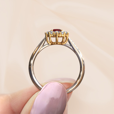 Der oben gezeigte Ring wird Leesa 2 genannt. Ein Cluster Ring mit einem zentralen Edelstein, umgeben von kleineren Steinen, wir nennen das einen Cluster Ring. Diese Version in 14 Karat Weißgold hat einen 6x4 mm oval Rubin als Mittelstein, umschlossen von kleineren Diamanten. Der klassische, Weißgold Cluster Verlobungsring zeichnet sich durch seine Form aus. Zusammen bilden die kleineren und größeren Rubin eine Blume und scheinen zu einem großen, funkelnden Edelstein zu verschmelzen. Dieser klassische Verlobungsring wird auch als Blumen- oder Rosettenring bezeichnet. Unsere erfahrenen Juweliere stellen sicher, dass die kleineren Diamanten identisch gesetzt sind, so dass es an dem Rubin keine Lichtstörungen gibt, sondern sie stattdessen eine Einheit bilden. Mit perfekter Präzision und geschickter Hand wird jeder Rubin in den Ring gesetzt. Während der Herstellung wird alles ständig überwacht, um sicherzustellen, dass das Licht einwandfrei reflektiert wird. Das alles führt zu einem einzigartigen Verlobungsring mit einem strahlenden Rubin in seiner Mitte. Ein schönes, bedeutungsvolles Geschenk, um es der Liebe Ihres Lebens zu schenken. Haben Sie ein bestimmtes Budget? Sie können uns gerne kontaktieren, damit wir Ihre Optionen besprechen können. Wir bieten unsere Verlobungsringe zum garantiert besten Preis, denn wir fertigen sie auf Bestellung. Solche Preise finden Sie nirgendwo anders!Unsere Designer und Goldschmiede arbeiten jeden Tag zusammen und versuchen, neue Schmuckstücke zu kreieren. Vielleicht haben Sie irgendwo einen schönen, klassische Verlobungsring gefunden, nach dem Ihr einzigartiger Ring gestaltet werden kann. Setzen Sie sich mit uns in Verbindung. Wir machen Ihnen ein Angebot, basierend auf einem fairen Preis/Leistungsverhältnis, das Sie begeistern wird.Um es einfacher zu machen, bieten wir eine kostenlose 30-tägige Rücksendung.