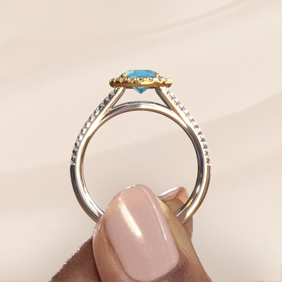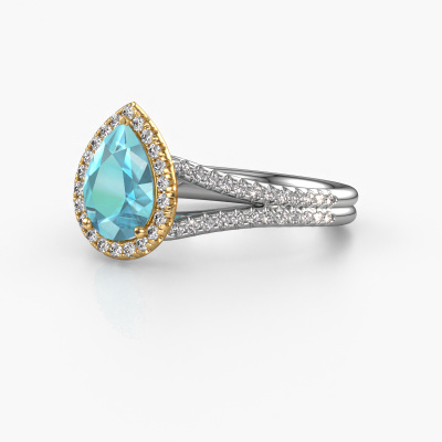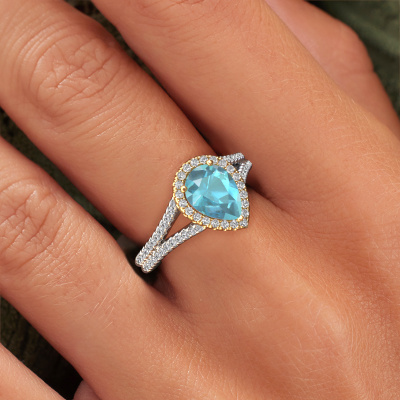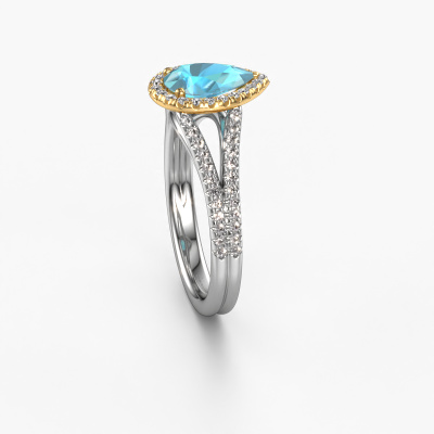 Der oben gezeigte Verlobungsring wird Verla pear 2 genannt. Es ist ein Halo Ring, da er einen zentralen Edelstein und ein Band mit Pavé-Fassung hat. Der 14 Karat Weißgold ring ist mit einem 8x6 mm tropfen Blau Topas-Mittelstein besetzt und um ihn herum eine Pavé-Fassung mit Diamanten. Was diesen exklusive, Weißgold Halo Ring besonders macht, sind die kleineren Steine, die den zentralen Stein umschließen. Dieser wunderschöne Verlobungsring wird als Halo Ring bezeichnet, da die kleineren Edelsteine dem zentralen Stein einen Lichthof geben. Damit die kleineren Steine den Mittelstein verstärken, müssen sie so platziert werden, dass keine Lichteinflüsse auftreten. Und hier kommen unsere erfahrenen Goldschmiede ins Spiel. Jeder einzelne Stein wird sorgfältig von Hand in den Ring gesetzt. Während der Herstellung wird der Lichteinfall ständig überprüft. So können wir sicherstellen, dass der spezielle Lichtkranz noch sichtbar ist. Am Ende erhalten Sie einen einzigartigen Verlobungsring mit einem Blaue Topas Ihrer Wahl in der Mitte. Sie können sich die Wirkung eines solchen Ringes vorstellen, wenn Sie ihn an ihrem besonderen Tag für sie zum Leuchten bringen. Nach Erhalt Ihrer Bestellung beginnen unsere Goldschmiede mit Leidenschaft den kreativen Prozess und fertigen Ihren Verlobungsring in unserem eigenen Studio. Da wir keine großen Lager haben, werden diese Kosten nicht an Sie weitergegeben. Unsere Preisgestaltung ist der Beweis dafür! Wir bieten Schmuck zum niedrigsten Preis, garantiert.Unsere Designer und Goldschmiede arbeiten jeden Tag zusammen und versuchen, neue Schmuckstücke zu kreieren. Vielleicht haben Sie irgendwo einen schönen, exklusive Verlobungsring gefunden, nach dem Ihr einzigartiger Ring gestaltet werden kann. Setzen Sie sich mit uns in Verbindung. Wir machen Ihnen ein Angebot, basierend auf einem fairen Preis/Leistungsverhältnis, das Sie begeistern wird.Um es einfacher zu machen, bieten wir eine kostenlose 30-tägige Rücksendung.